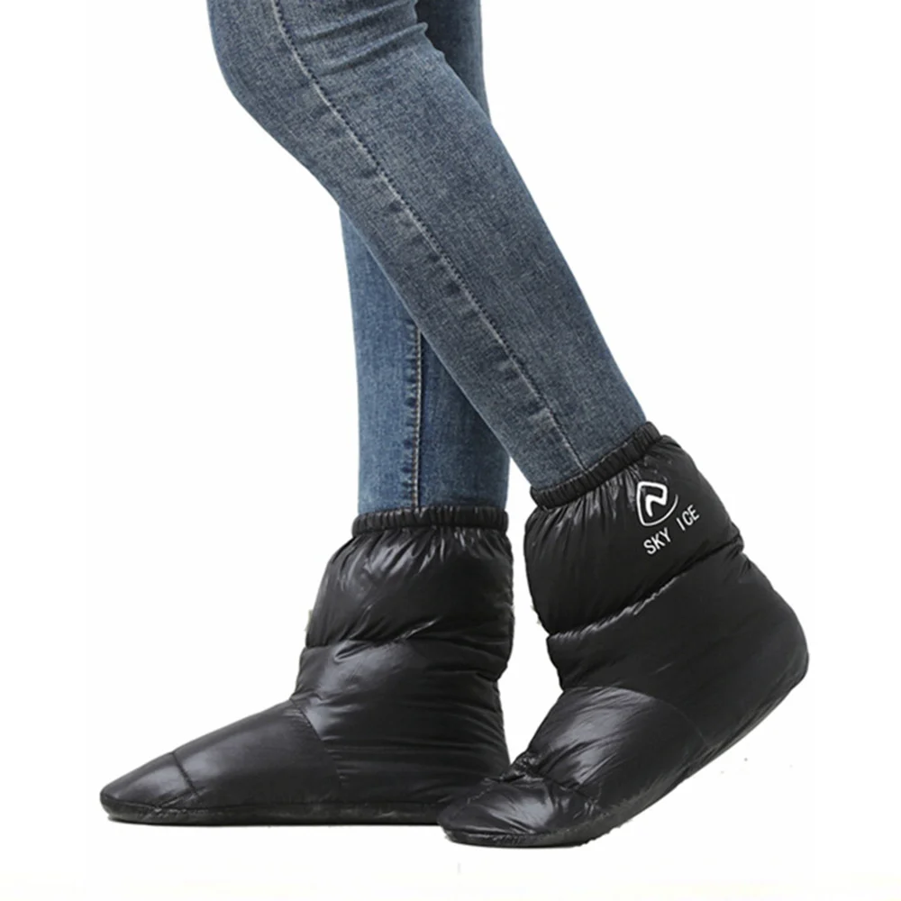 These down-filled sleeping booties are designed to keep your feet warm and cozy during cold nights. Filled with 90% white duck down, they provide excellent insulation for winter camping or indoor use. The waterproof exterior protects your feet from moisture and damp conditions. Soft and lightweight, they offer comfort without adding bulk. Ideal for camping, backpacking, or cabin trips, they fit easily inside tents or sleeping bags. The booties double as warm socks, covering your feet entirely for maximum heat retention. Durable construction ensures long-lasting use in rugged outdoor conditions. Their slip-on design makes them convenient for quick wear and removal. Breathable materials prevent overheating while keeping feet snug and comfortable. Enjoy warm, toasty feet in any outdoor adventure with these thermal sleeping booties.